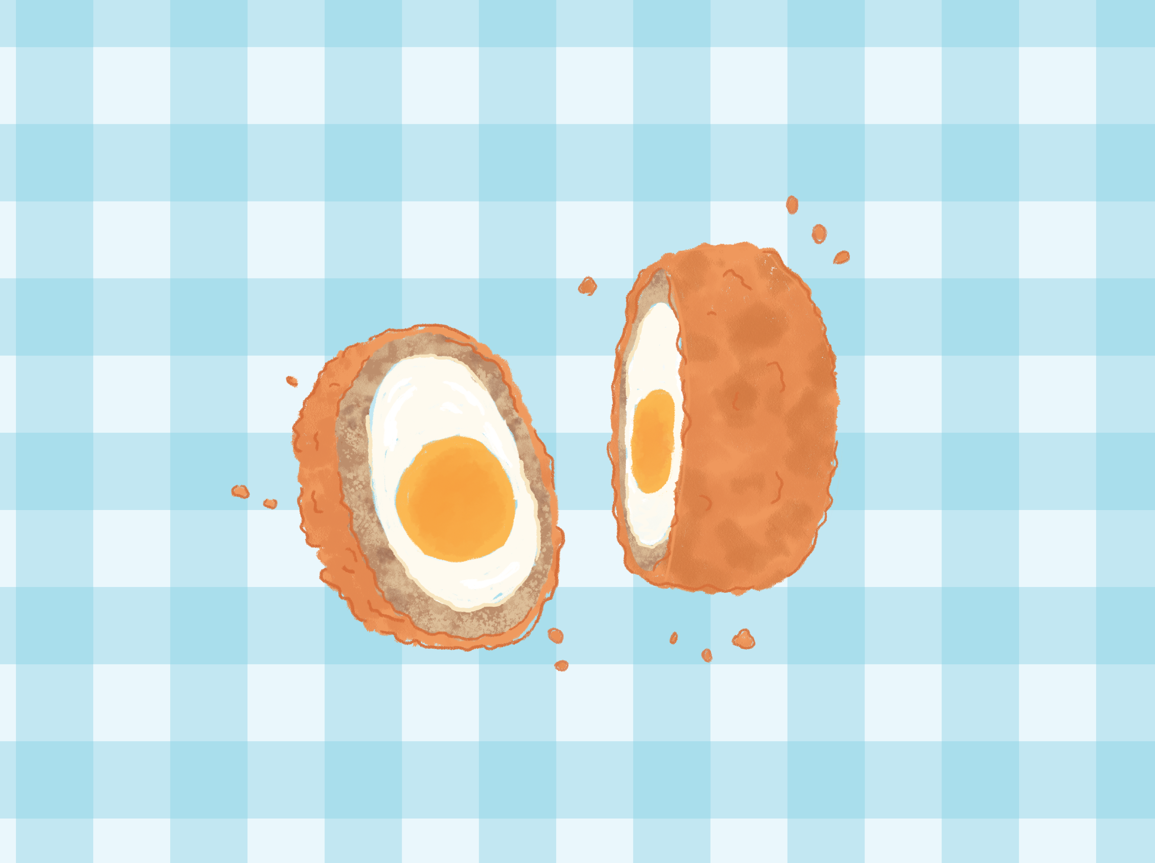 Put the remaining beaten egg into a bowl, roll the chilled eggs in the remaining flour, then dip into the beaten egg and finally roll in the breadcrumbs.